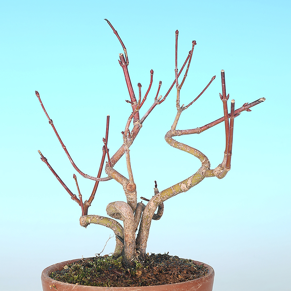 4月頃に萌芽する新芽は、芽がほころんだ頃に先端を摘み取るのが基本作業。枝を太らせたい場合は摘み取らずに犠牲枝として伸ばしておきます。若木であれば5~6月頃に葉刈りを行うこともできますが、葉刈りをすると不定芽を多く生じて芽処理に手間がかかります。枝が混んでくれば葉刈りをやめて日照や培養条件を改善する目的で葉を半分に切る「葉切り」や対生で出る葉の片方だけを切る「葉透かし」などを行いましょう。整姿の適期は6月頃。剪定は落葉直後もしくは芽動き直前の3月頃が最適です。