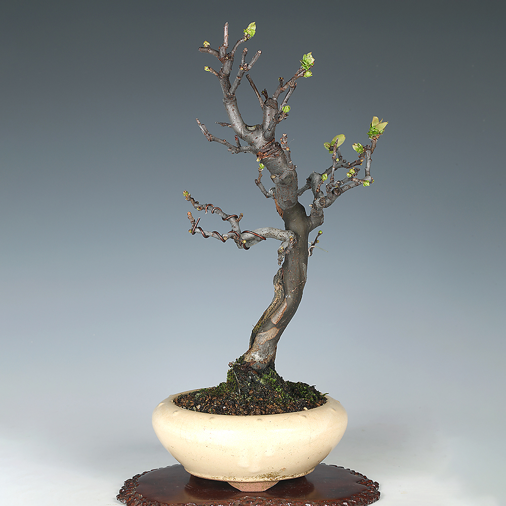 美しい黄色の実、春の可憐な桃色に花、秋の紅葉、そして独特の幹肌と一年を通して楽しめる雑木盆栽の人気樹種・かりん。実物盆栽の王様とも称されています。唐かりんは実生カリンの台木に成熟した穂木を接いだもので、比較的早く実が楽しめる品種で、初心者にもおすすめ。