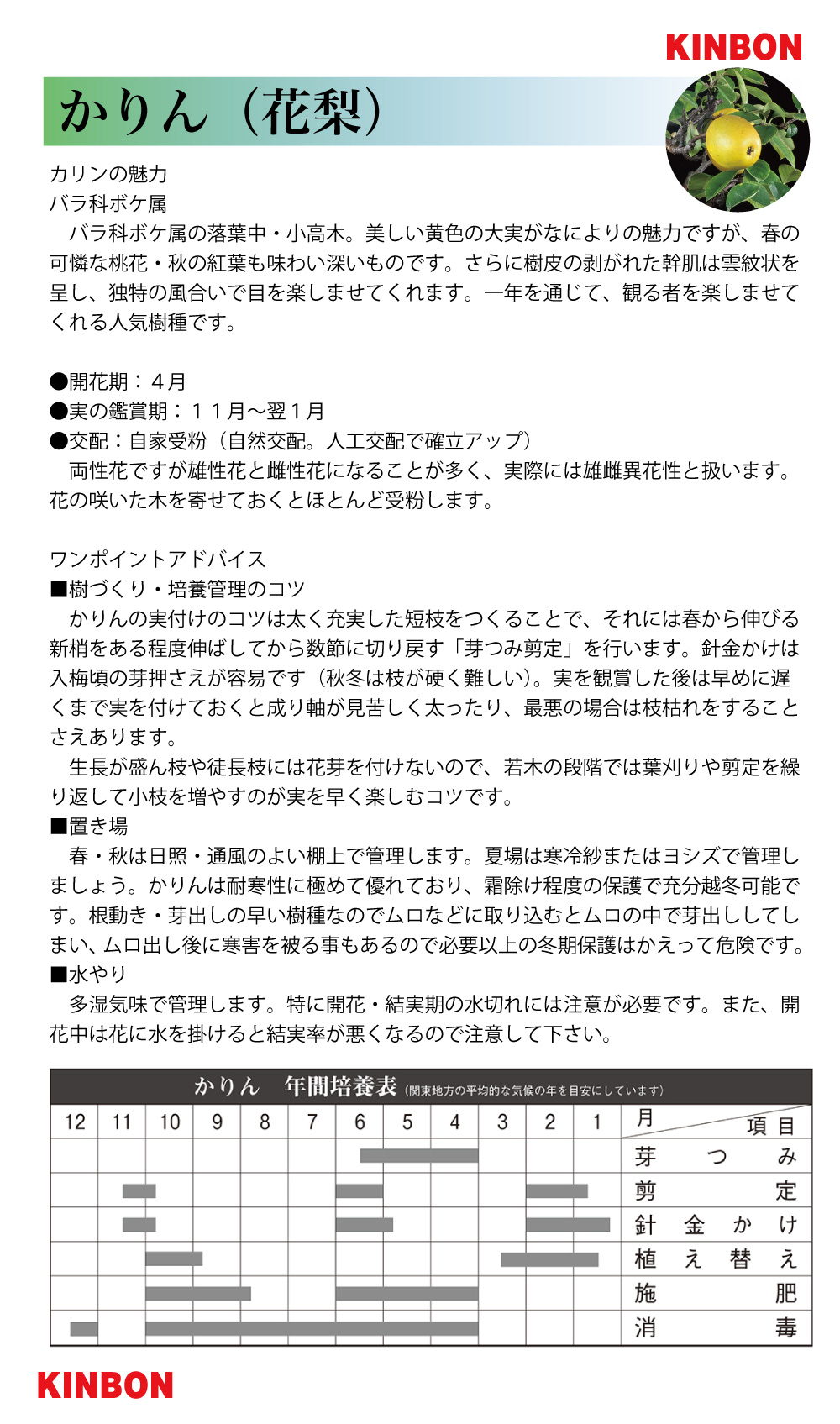 春・秋は日照・通風のよい棚上で管理します。夏場は寒冷紗またはヨシズで管理しましょう。かりんは耐寒性に極めて優れており、霜除け程度の保護で充分越冬可能です。根動き・芽出しの早い樹種なのでムロなどに取り込むとムロの中で芽出ししてしまい、ムロ出し後に寒害を被る事もあるので必要以上の冬期保護はかえって危険です。