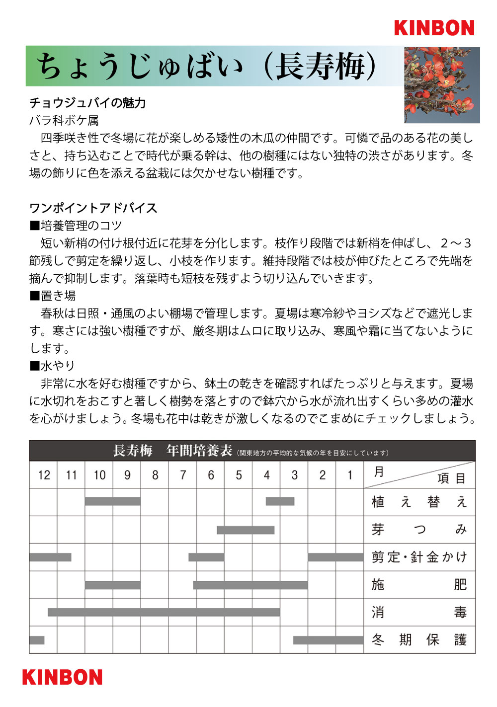 四季咲き性で冬場に花が楽しめる矮性の木瓜の仲間・長寿梅。可憐で品のある花と時代が乗り幹肌は他のはない魅力を持っています。冬場に色を添える盆栽には欠かせない樹種です。