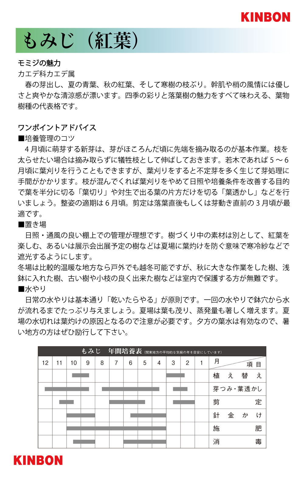 4月頃に萌芽する新芽は、芽がほころんだ頃に先端を摘み取るのが基本作業。枝を太らせたい場合は摘み取らずに犠牲枝として伸ばしておきます。若木であれば5~6月頃に葉刈りを行うこともできますが、葉刈りをすると不定芽を多く生じて芽処理に手間がかかります。枝が混んでくれば葉刈りをやめて日照や培養条件を改善する目的で葉を半分に切る「葉切り」や対生で出る葉の片方だけを切る「葉透かし」などを行いましょう。整姿の適期は6月頃。剪定は落葉直後もしくは芽動き直前の3月頃が最適です。