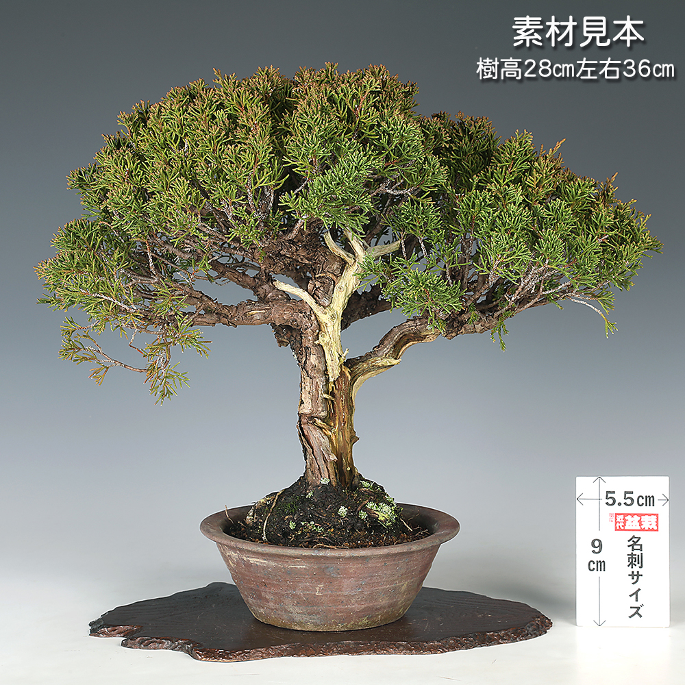 じっくりと鉢で育てられ、寸法の割に古さを備えた糸魚川真柏の貴重な素材です。独特のシャリ幹は野趣を感じさせます。素材ごとに樹形にバラツキあり。