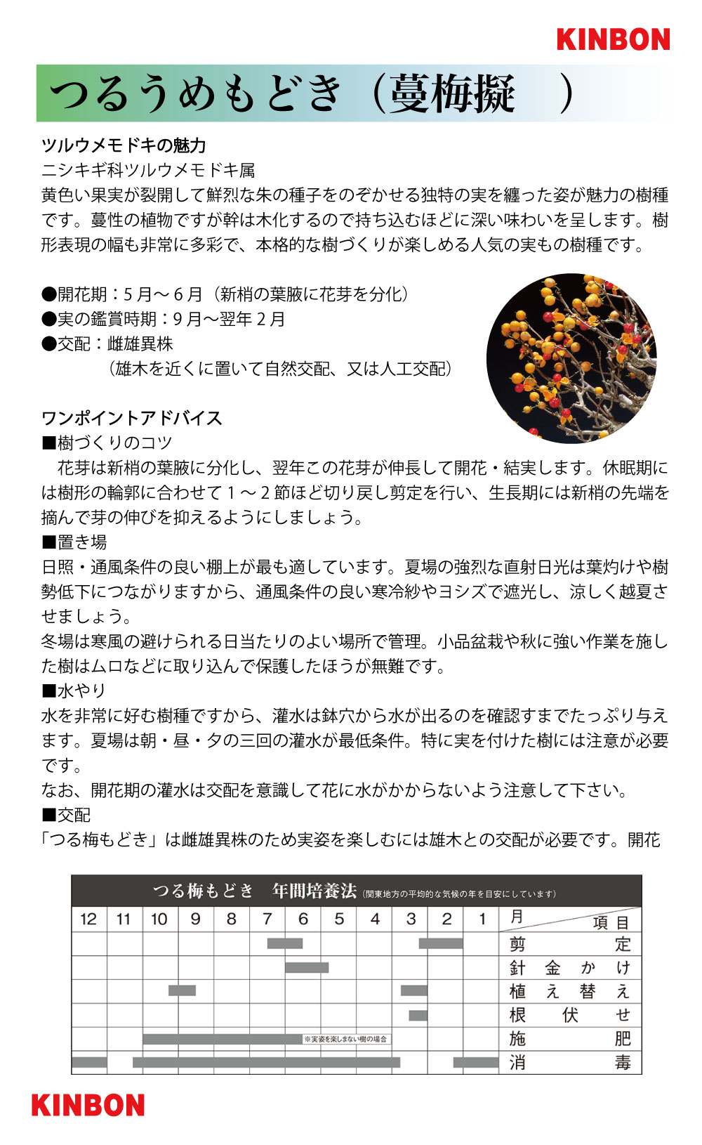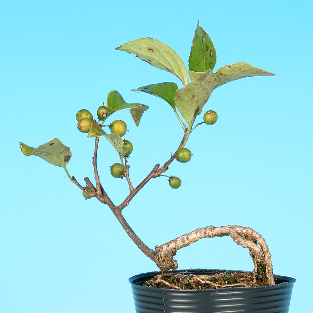黄色い果実が裂開して鮮烈な朱の種子をのぞかせる独特の実を纏った姿が魅力の樹種です。蔓性の植物ですが幹は木化すので持ち込むほどに深い味わいを呈します。樹形表現の幅も非常に多彩で、本格的な樹づくりが楽しめる人気の実もの樹種です。