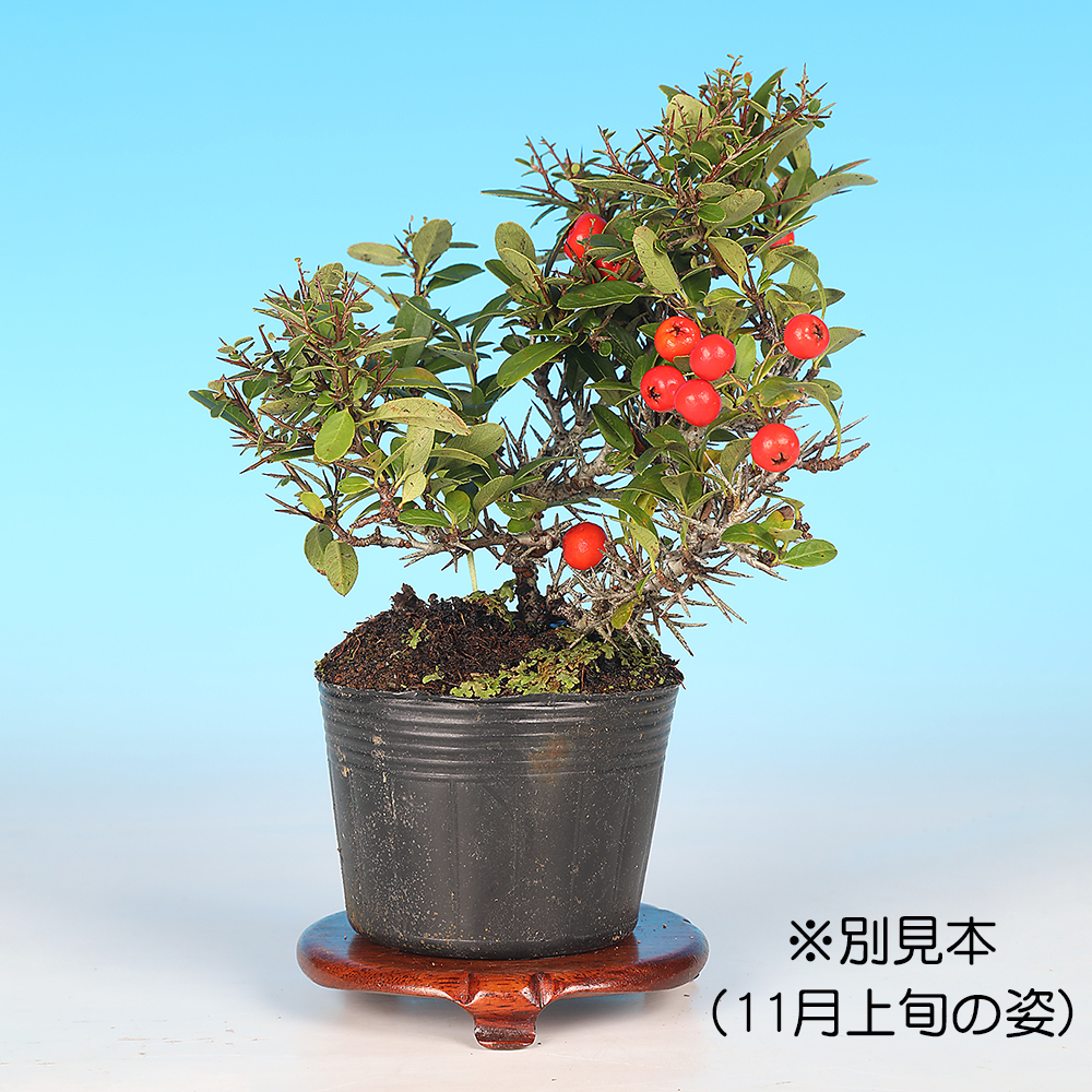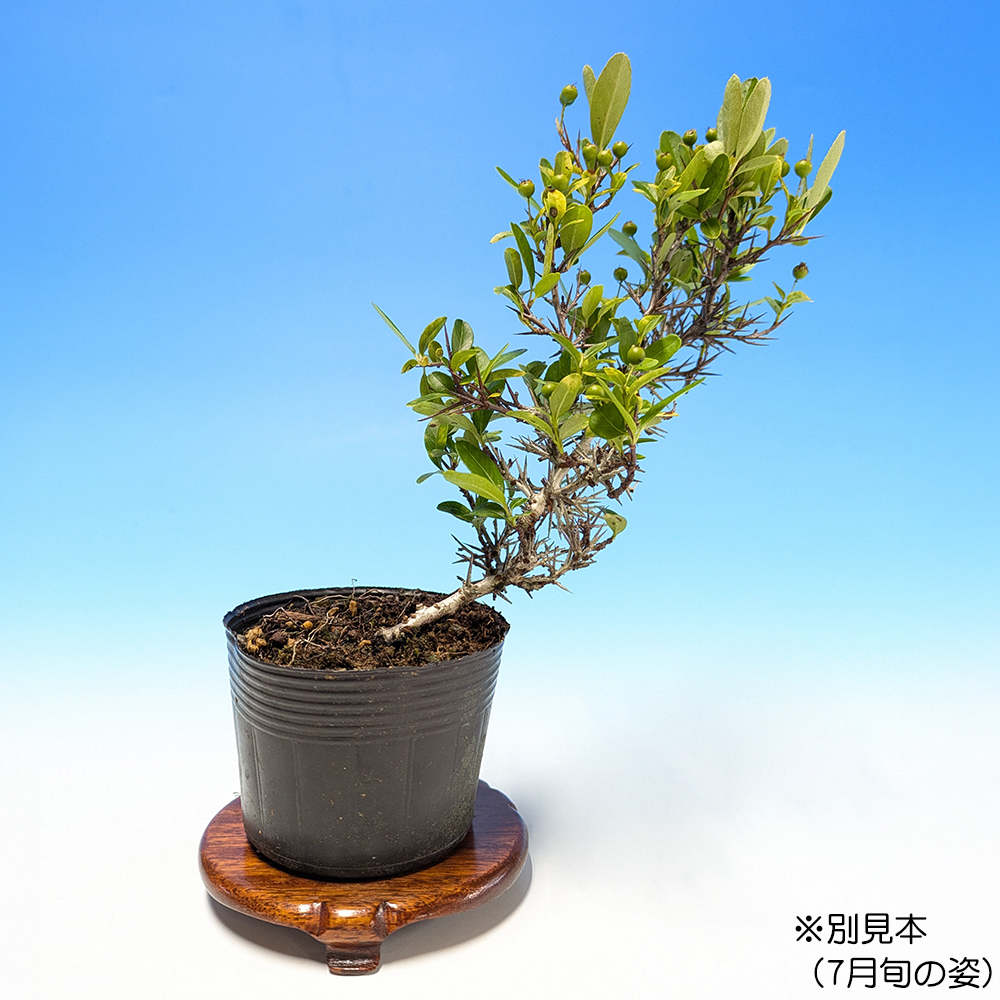 「橘もどき」の小型種で枝打ちが細かいのが特徴です。小品・ミニ盆栽に適しています。サイズを意識しながら樹づくりをお楽しみ下さい。小さな盆樹ながら時を重ねるごとに現れる幹肌や実姿など見所は沢山!! 樹性強健なので初心者の方にもオススメの素材です。