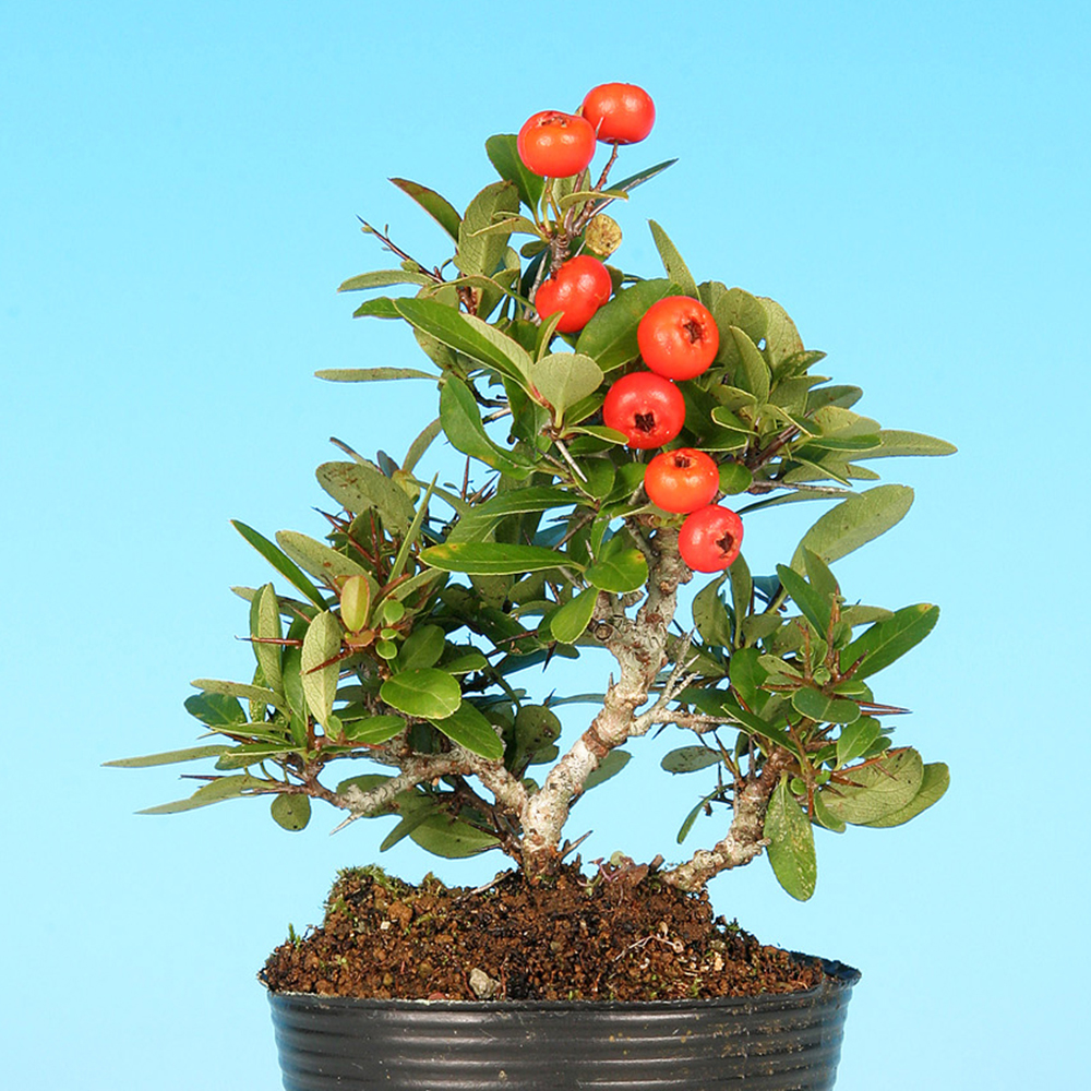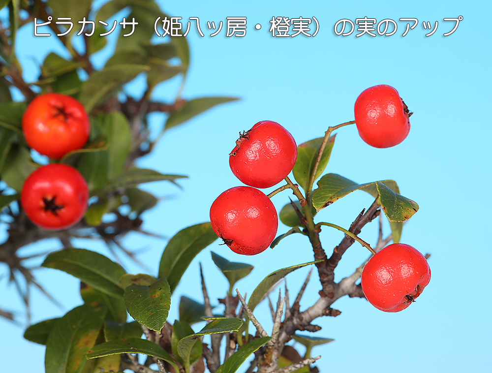 バラ科の常緑低木。実色が濃紅色のトキワサンザシと黄橙色のタチバナモドキの2種が一般的です。強健種で育てやすく、自然交配により容易に実成りが楽しめることから人気の高い樹種の一つです。
