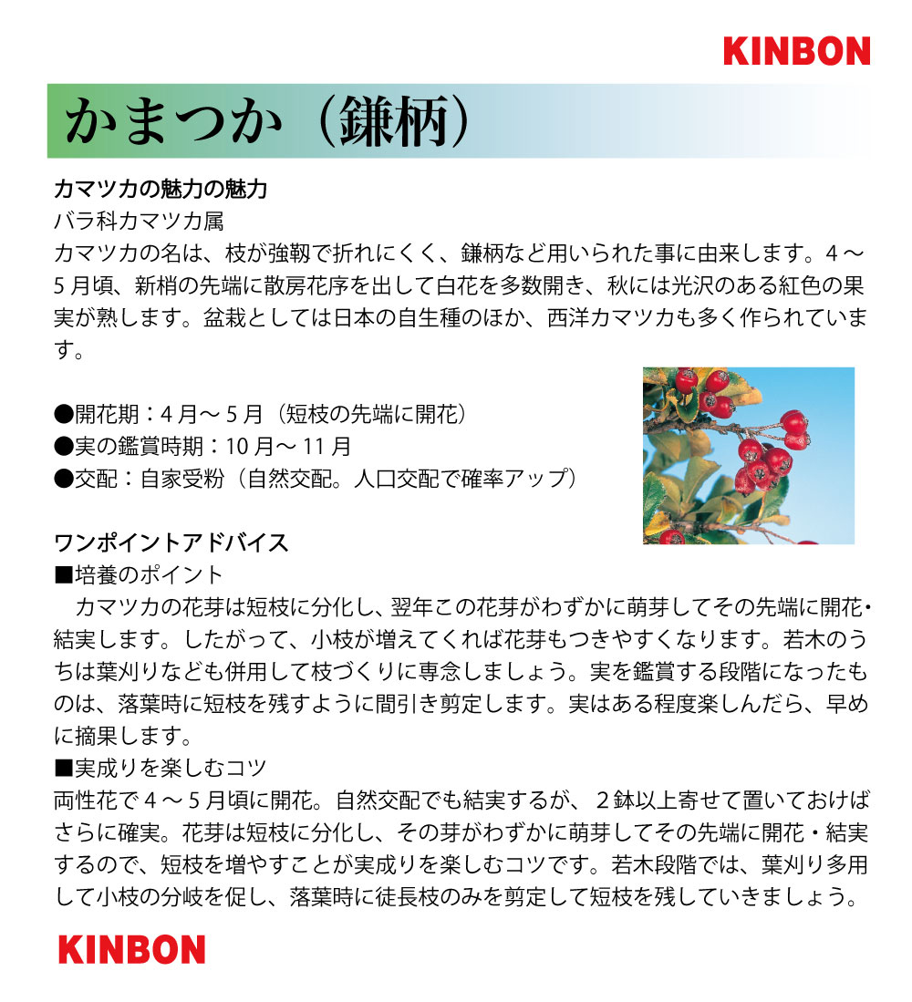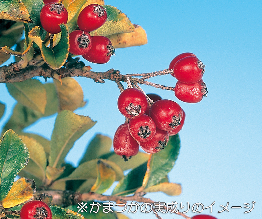 4~5月頃、白色の花を多数咲かせる花姿は上品な美しさです。そして秋に色づく紅色の小さな実姿も可憐です。季節の変化に応じて見所の多い「かまつか」の苗木素材。一才性で花芽の分化がしやすく、早く実姿が楽しめるのが魅力です。基本的な性質は普通種と同じです。