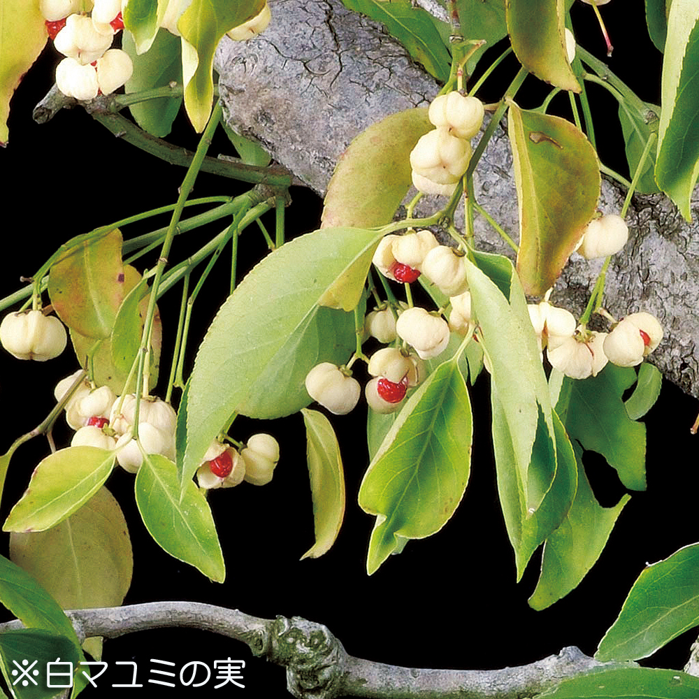 盆栽樹種としては比較的ポピュラーな存在のまゆみの苗木素材。普通種との違いは実の周りを包む仮種皮が桃色なのに対して、仮種皮が白く、裂開した時に覗く実の赤とのコントラストが魅力の品種です。