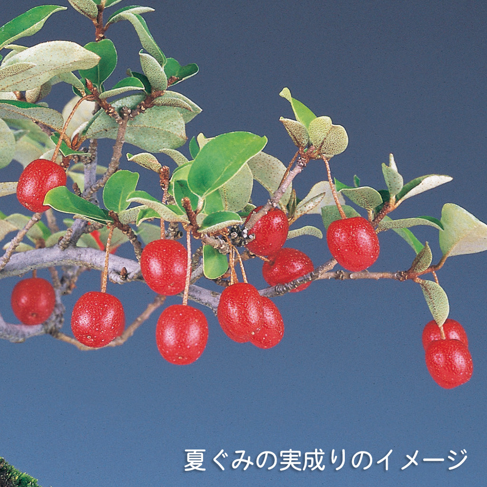 夏ぐみの一才性品種です。比較的若い素材でも実が楽しめる品種です。夏ぐみは落葉樹で枝に細刺があります。5~6月頃の初夏に花を咲かせ、8月~10頃に果実が紅熟します。苗木素材ですので樹形やサイズにバラツキなどはありますが、一から育てる楽しさがあります。