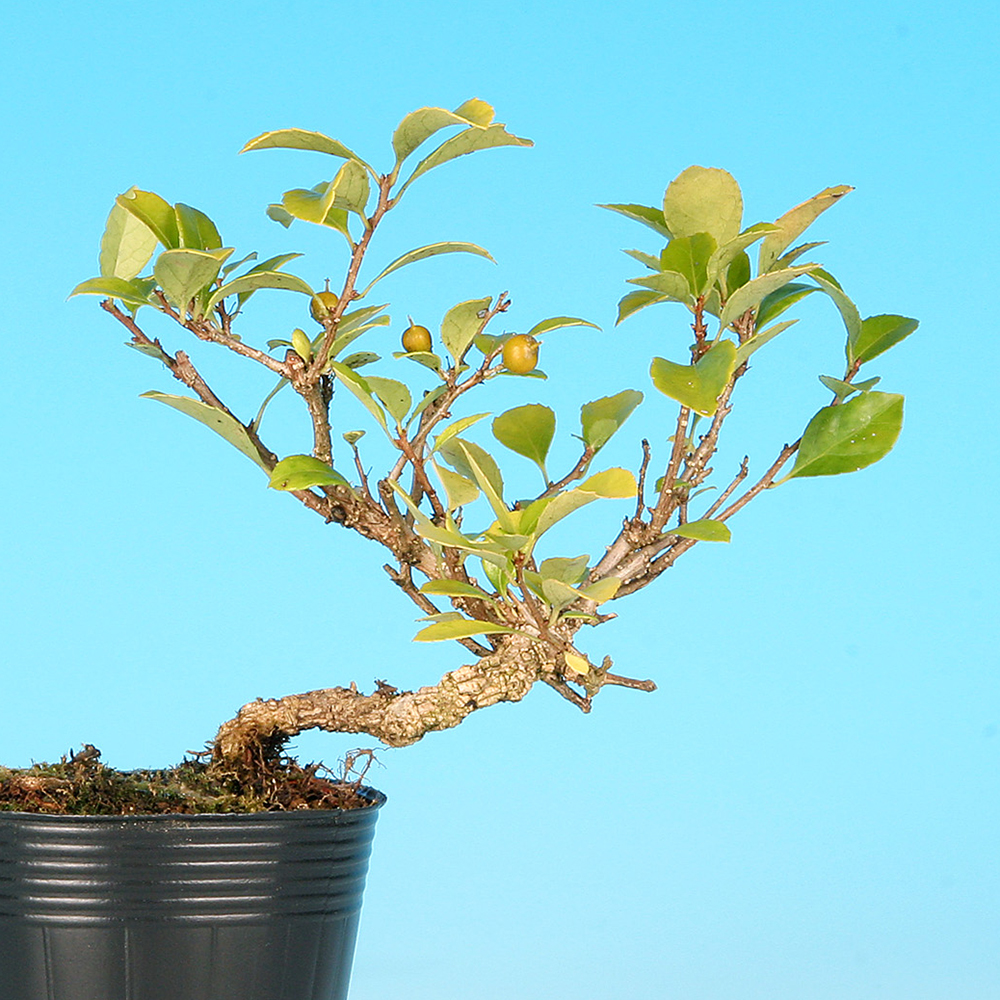 黄色い果実が裂開して鮮烈な朱の種子をのぞかせる独特の実を纏った姿が魅力の樹種です。蔓性の植物ですが幹は木化すので持ち込むほどに深い味わいを呈します。樹形表現の幅も非常に多彩で、本格的な樹づくりが楽しめる人気の実もの樹種です。