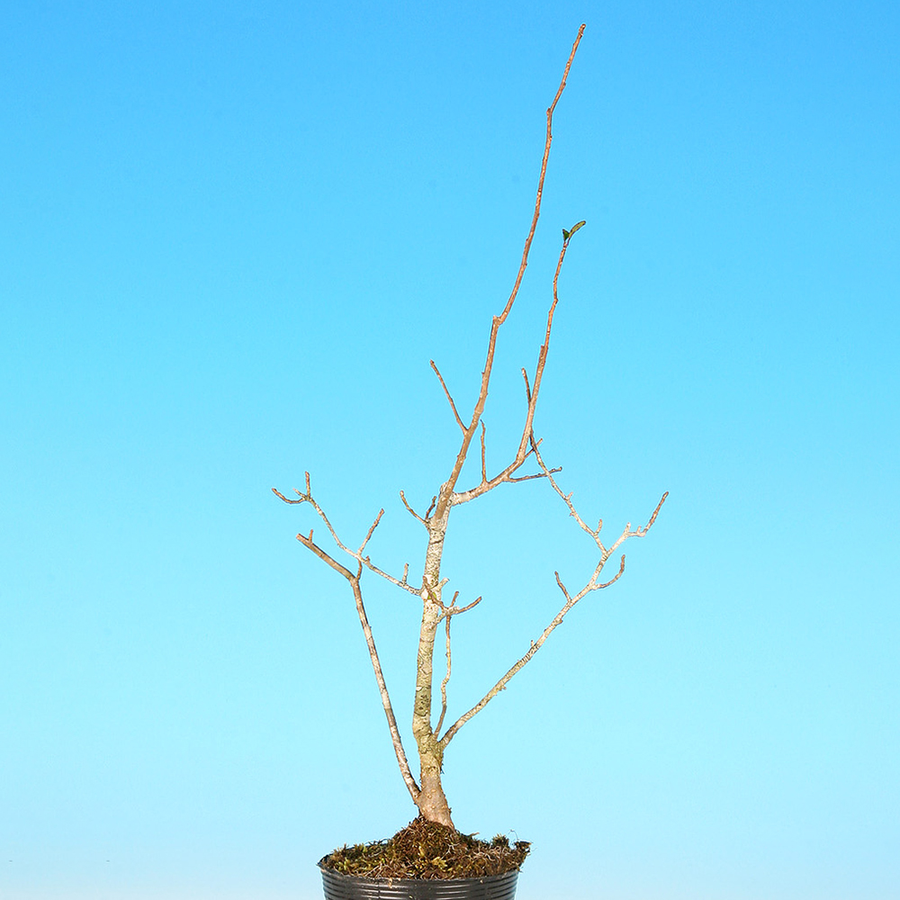 梅もどきの交配用の雄木素材です。梅もどきは雌雄異株の樹種のため、実姿を楽しむには雄木との交配が必要不可欠。雌花は白色の花弁で雄花は赤紫色の花弁に黄色のオシベの組合せです。雄木を雌木の近くに置いて自然交配、あるいは人口交配で受粉させます。もちろん、盆栽として一から樹づくり、花姿も楽しむこともできます。