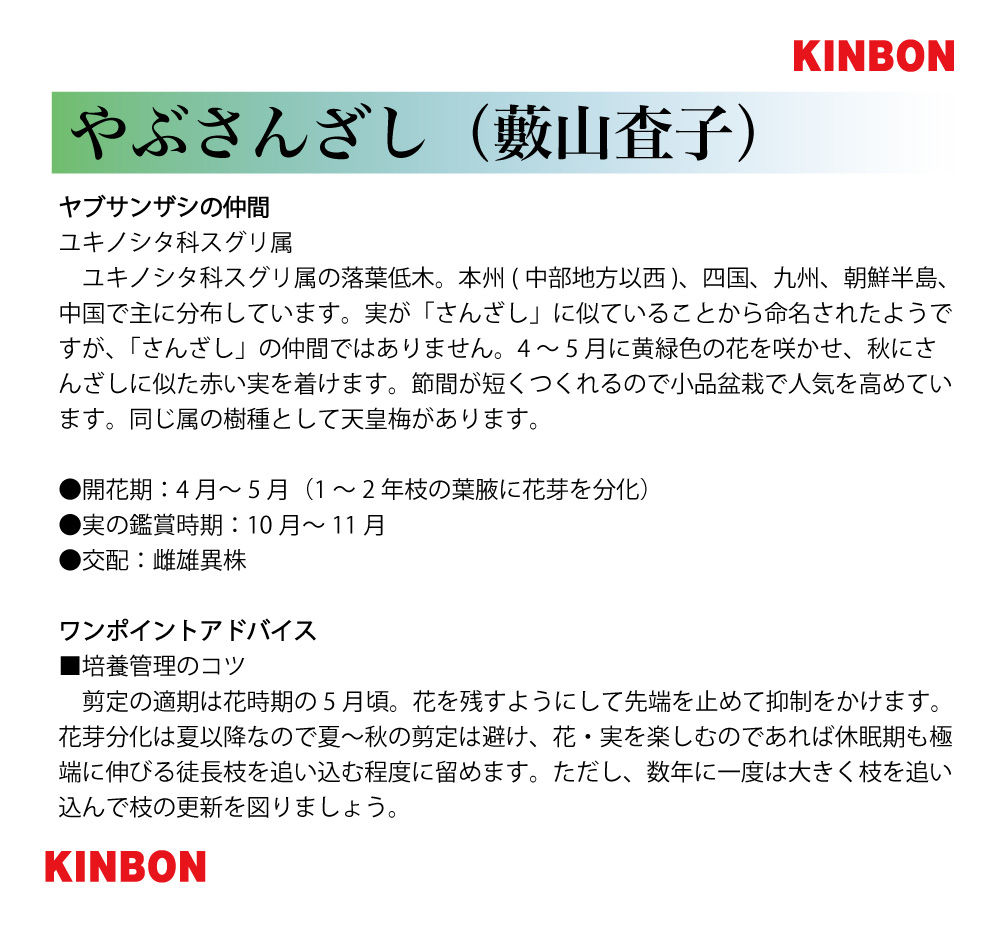ユキノシタ科スグリ属の落葉低木。本州(中部地方以西)、四国、九州、朝鮮半島、中国で主に分布しています。実が「さんざし」に似ていることから命名されたようですが、「さんざし」の仲間ではありません。4~5月に黄緑色の花を咲かせ、秋にさんざしに似た赤い実を着けます。節間が短くつくれるので小品盆栽で人気を高めています。同じ属の樹種として天皇梅があります。