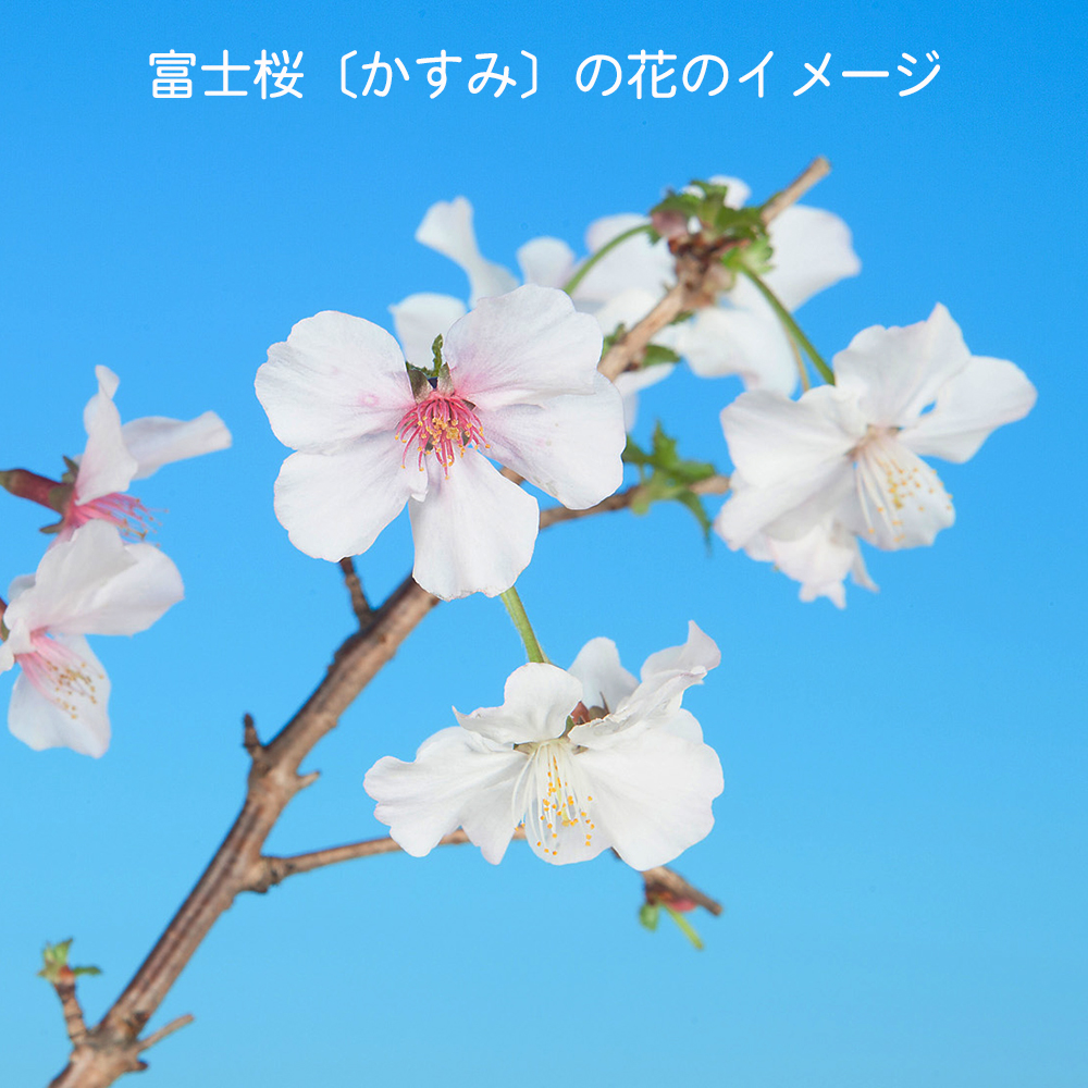 富士桜の一品種で一重の大輪で白から薄桃色の花を咲かせる人気品種〔かすみ〕。大きく育てるのもよし。ミニ盆栽に仕立てるのよしの苗木素材。卓上で手軽にお花見を楽しんで下さい。お部屋のインテリアやガーデニングなどにもオススメ。
