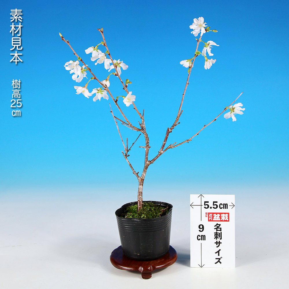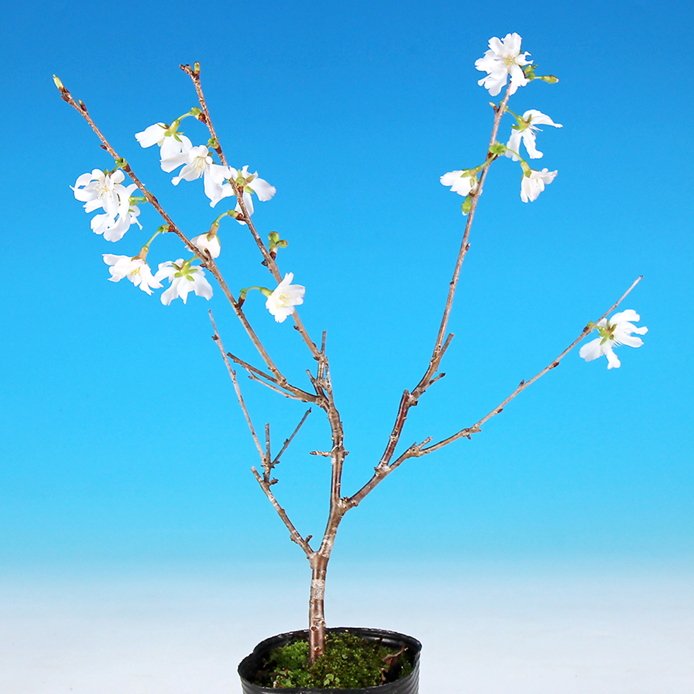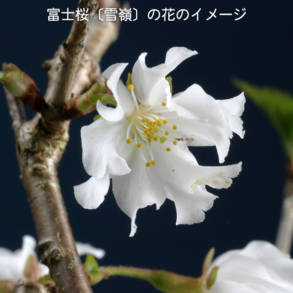 富士桜の一品種で花弁の先がフリル状になり、清楚な白花を咲かせる品種〔雪嶺〕。大きく育てるのもよし。ミニ盆栽に仕立てるのよしの苗木素材。卓上で手軽にお花見を楽しんで下さい。お部屋のインテリアやガーデニングなどにもオススメ。