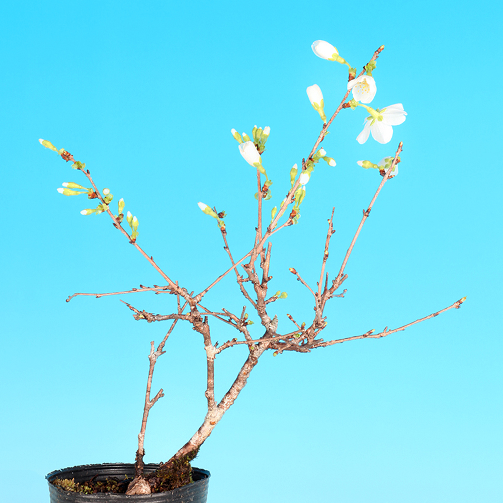 富士桜の一品種で小輪の純白の花を咲かせ、若枝、花柄、萼や萼筒が緑色になる爽やかな「ミドリザクラ」。大きく育てるのもよし。ミニ盆栽に仕立てるのよしの苗木素材。卓上で手軽にお花見を楽しんで下さい。お部屋のインテリアやガーデニングなどにもオススメ。