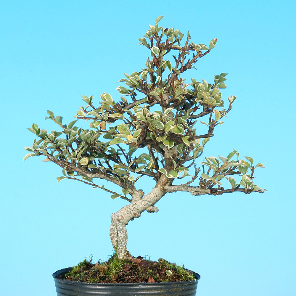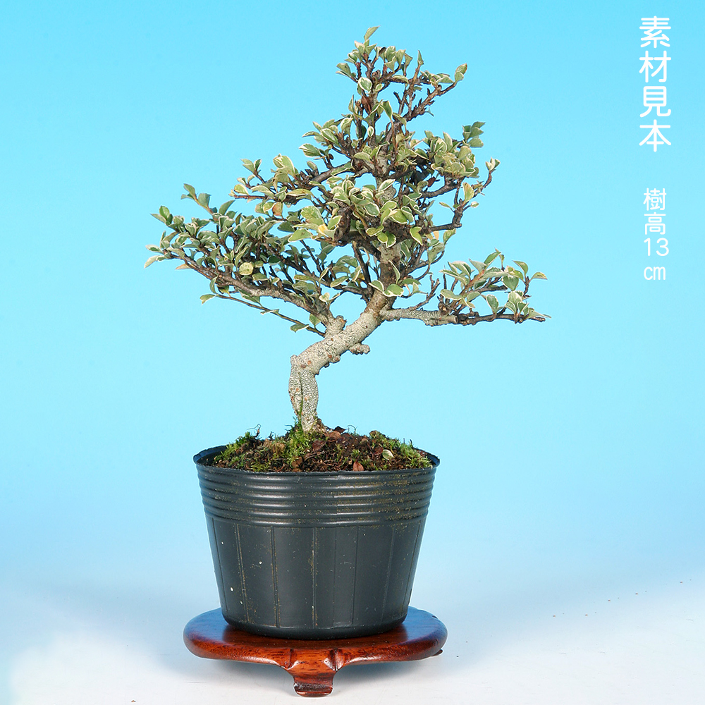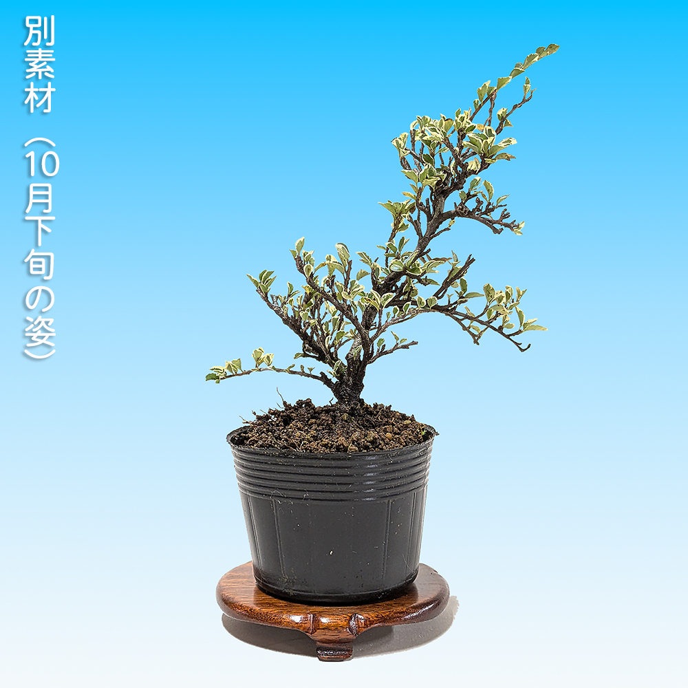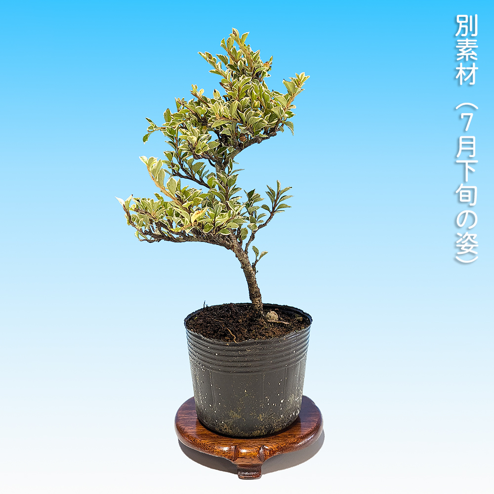 葉に白覆輪の斑が入るのが特徴の素材。普通種に比べ花つきはあまり良くはありませんが葉芸が美しいのが魅力。樹性も比較的強健で萌芽力も旺盛なので、様々な樹形を楽しむことができ、初心者の方にもオススメです。