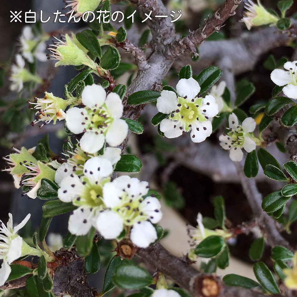 紅したんの白花種。赤花とは違って花弁が大きく開いて華やかな品種です。樹性も比較的強健で萌芽力も旺盛なので、様々な樹形を楽しむことができ、初心者の方にもオススメです。