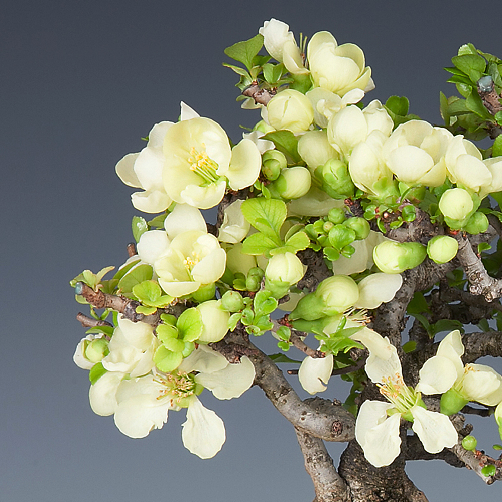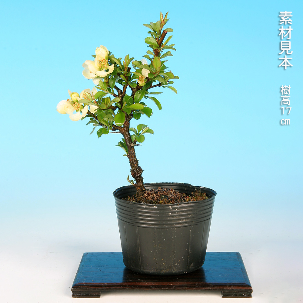 四季咲き性で冬場に花が楽しめる矮性の木瓜の仲間です。可憐で品のある花の美しさと、持ち込むことで時代が乗る幹は、他の樹種にはない独特の渋さがあります。冬場の飾りに色を添える盆栽には欠かせない樹種です。