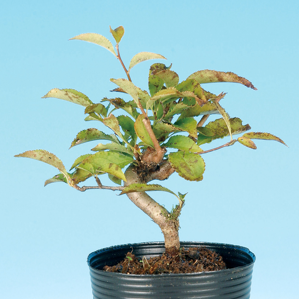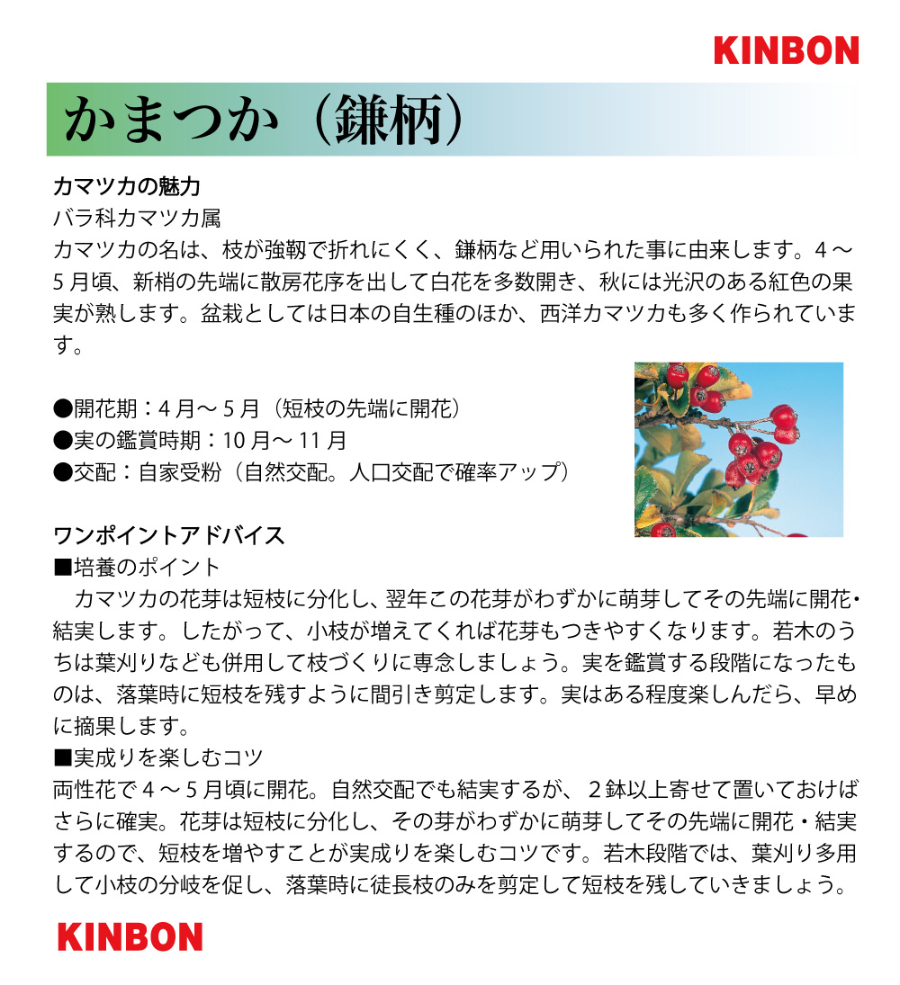 カマツカの名は、枝が強靱で折れにくく、鎌柄など用いられた事に由来します。4~5月頃、新梢の先端に散房花序を出して白花を多数開き、秋には光沢のある紅色の果実が熟します。盆栽としては日本の自生種のほか、西洋カマツカも多く作られています。