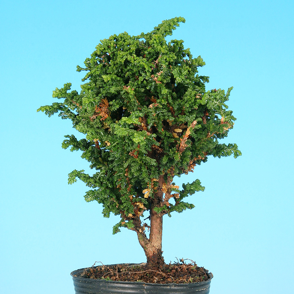 桧の石化性で、鱗状の葉が密生して着くのが特徴。枝が短く伸び止まるので小品盆栽に最適な品種で、樹皮も早くから荒れるのが特徴なのも魅力です。