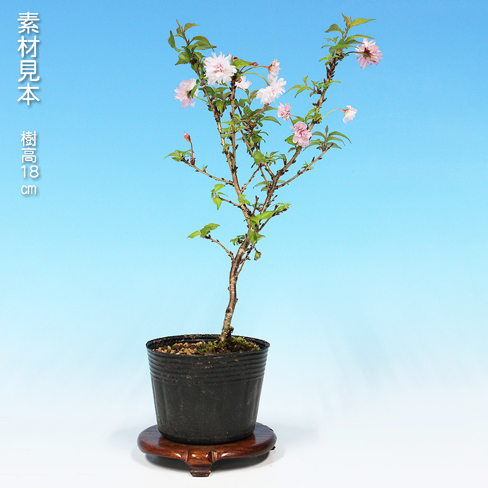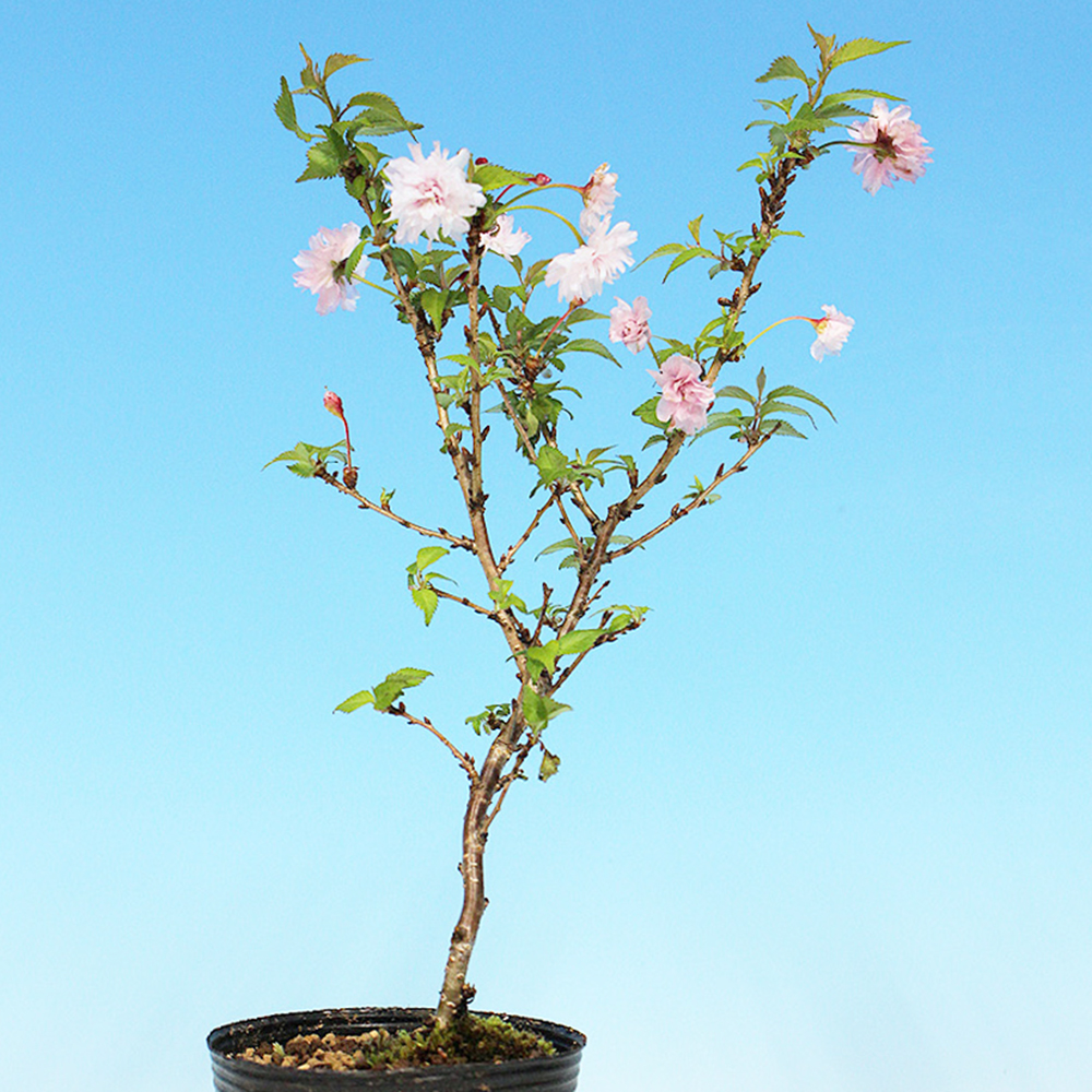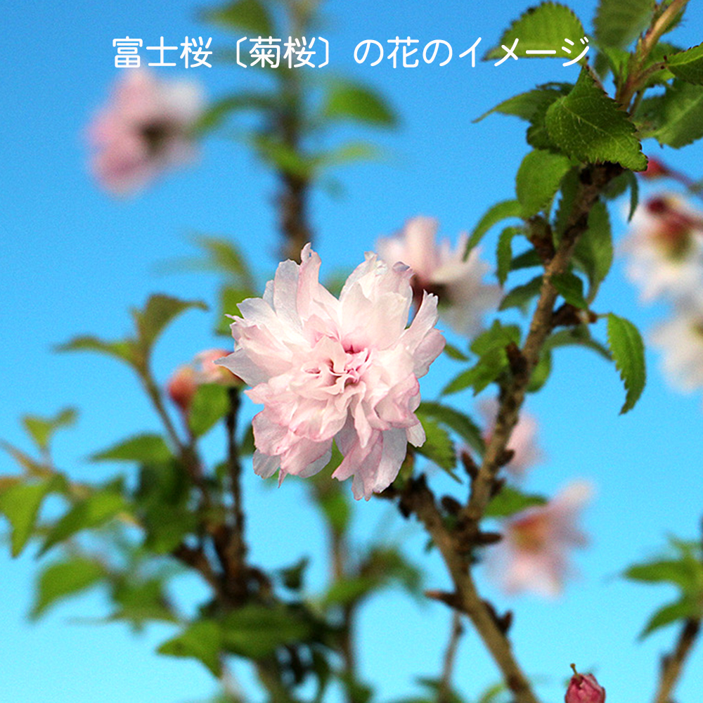 富士桜の一品種で菊のようにフリル状に咲く小ぶりな八重花がとても愛らしい品種の「菊桜」。原木は、静岡県富士宮市天子岳にあり、その後、同市にある大石寺に移植されました。二段咲き、三段咲きへと進む菊咲きの豪華な花姿が魅力です。大きく育てるのもよし。ミニ盆栽に仕立てるのよしの苗木素材。卓上で手軽にお花見を楽しんで下さい。お部屋のインテリアやガーデニングなどにもオススメ。