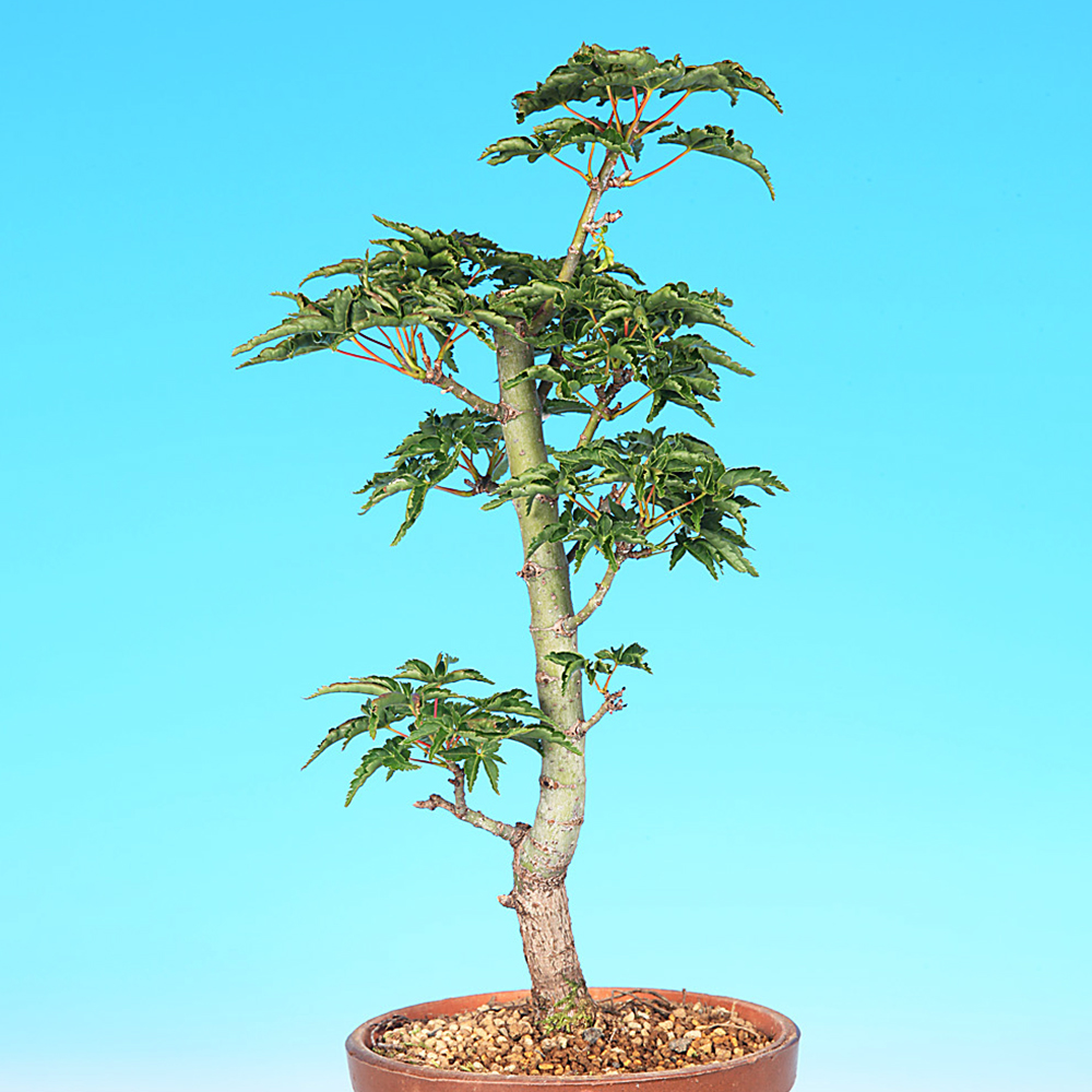 日照・通風の良い棚上での管理が理想です。樹づくり中の素材は別として、紅葉を楽しむ、あるいは展示会出展予定の樹などは夏場に葉灼けを防ぐ意味で寒冷紗などで遮光するようにします。