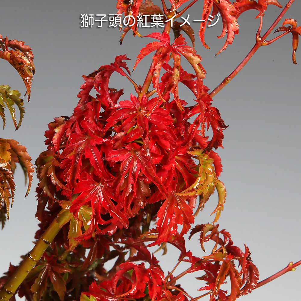 葉が深く切れ込み、縮れて密集する独特の葉芸と美しい紅葉が魅力の獅子頭。縮れて密集している葉姿を獅子(ライオン)のたてがみに見立てて付けられた名前です。樹形構想で改作や取り木素材としてなど樹づくりプランは豊富な優良素材です。