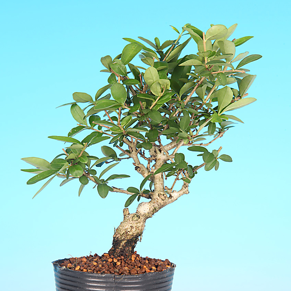 幹肌が荒れやすい品種の「荒皮いぼた」。素材の樹形にバラツキはありますが、小品・ミニ盆栽にと一から貴方好みに樹づくりが楽しめます。黒紫色の熟した実姿は見所です。