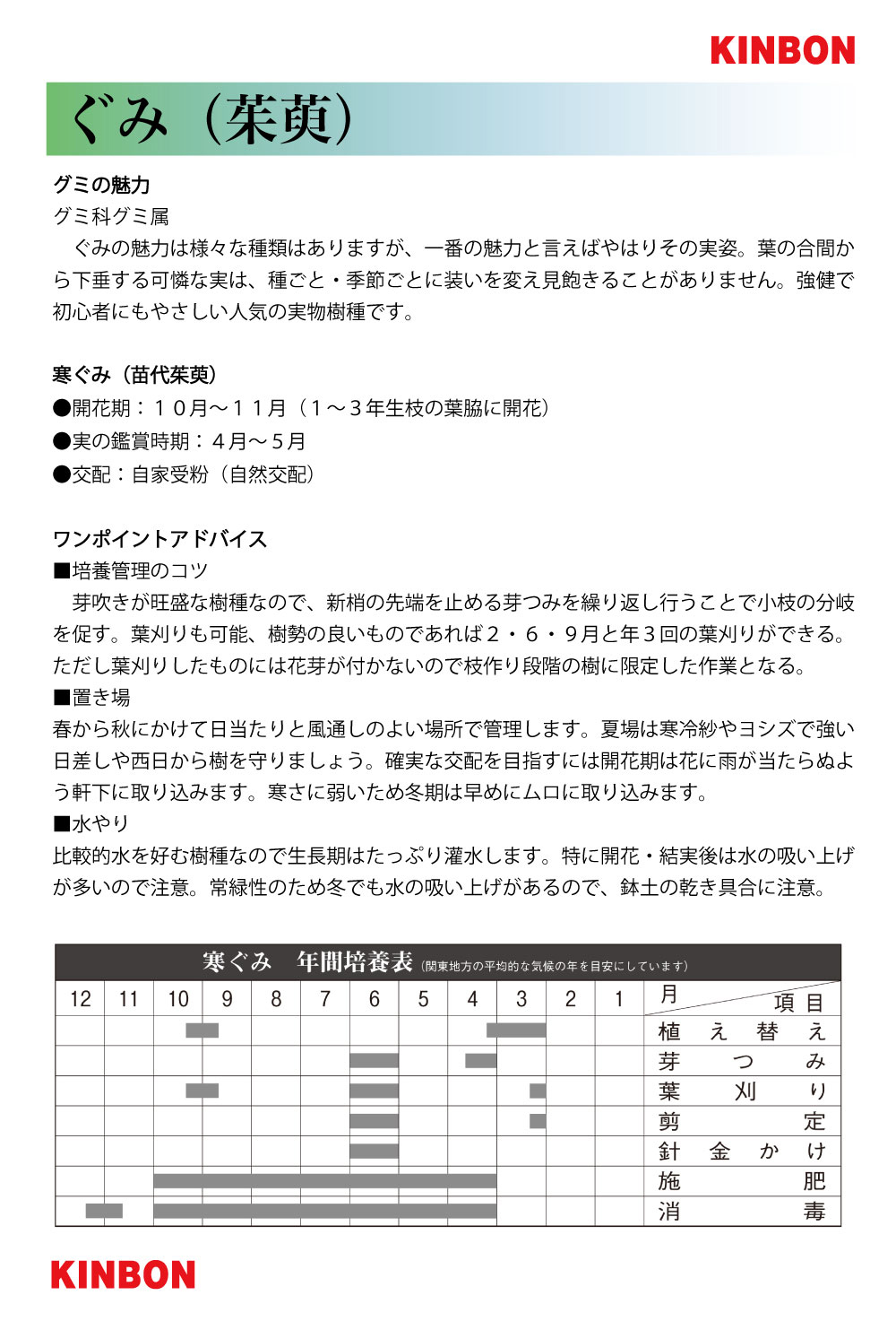 ぐみの魅力は様々な種類はありますが、一番の魅力と言えばやはりその実姿。葉の合間から下垂する可憐な実は、種ごと・季節ごとに装いを変え見飽きることがありません。強健で初心者にもやさしい人気の実物樹種です。