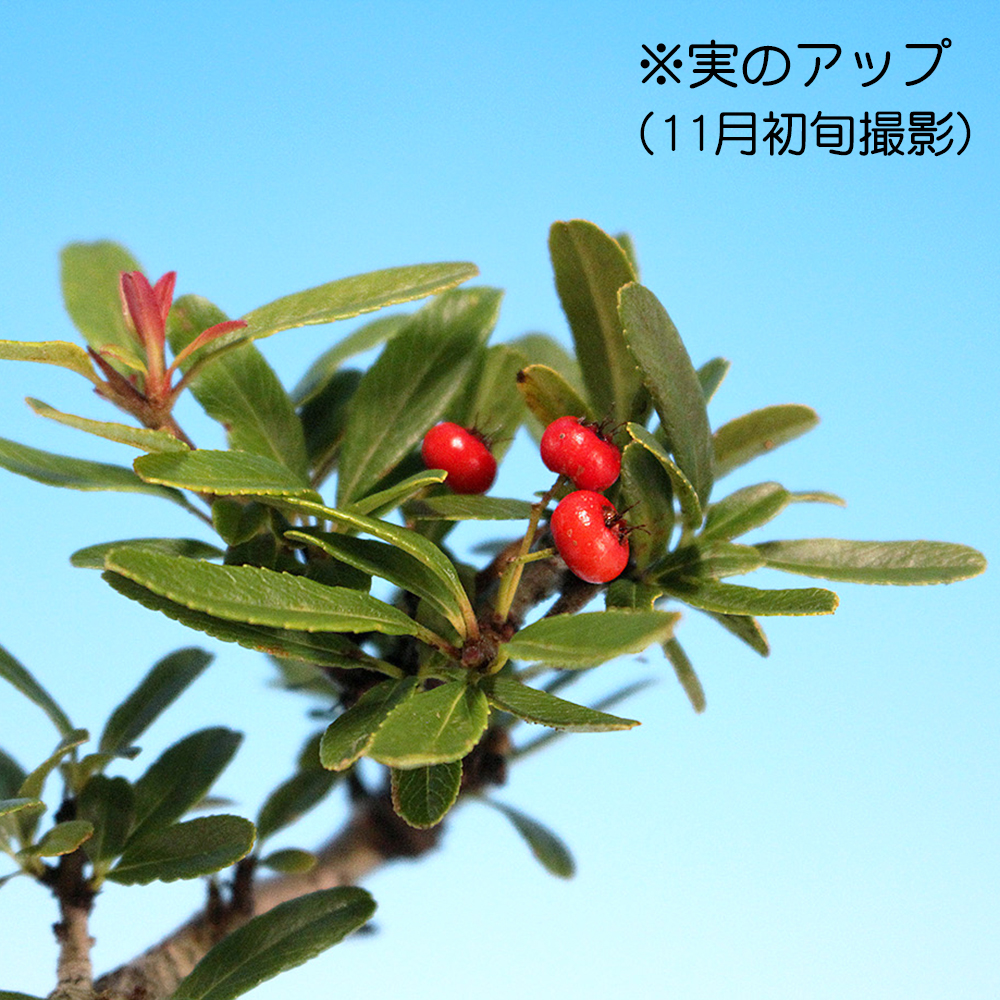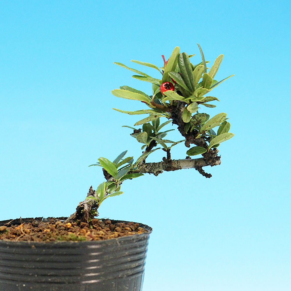 「トキワサンザシ」の中でも実付きが良く、小振りで鮮やかな紅色の実が特徴の品種(姫千代田紅)の苗木素材です。樹性強健なので初心者の方にもオススメです。樹形のバリエーションも多く、貴方の感性を活かした樹づくりをお楽しみ下さい。